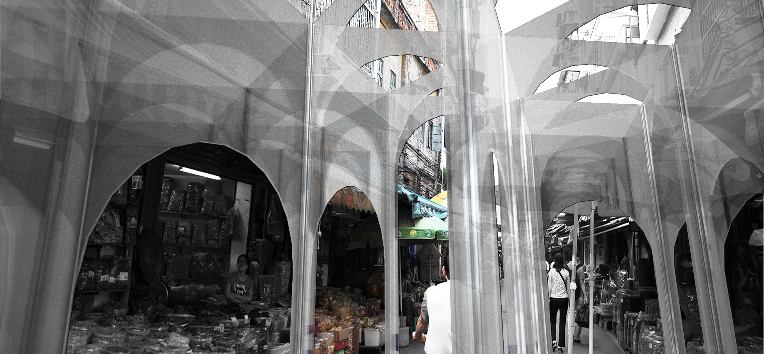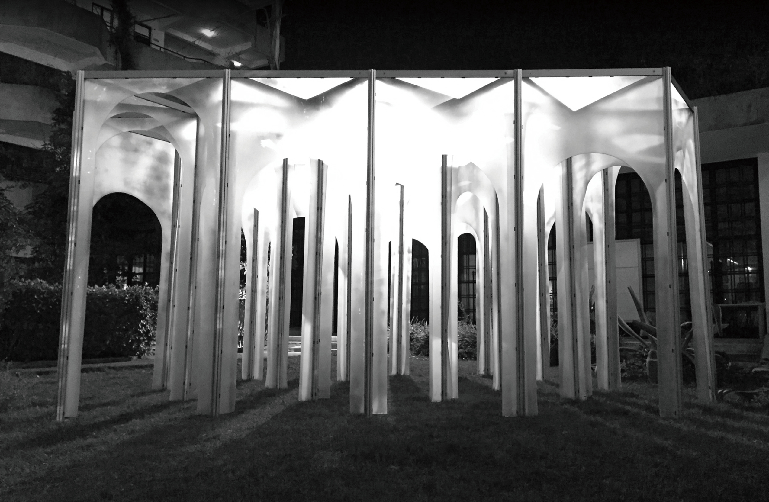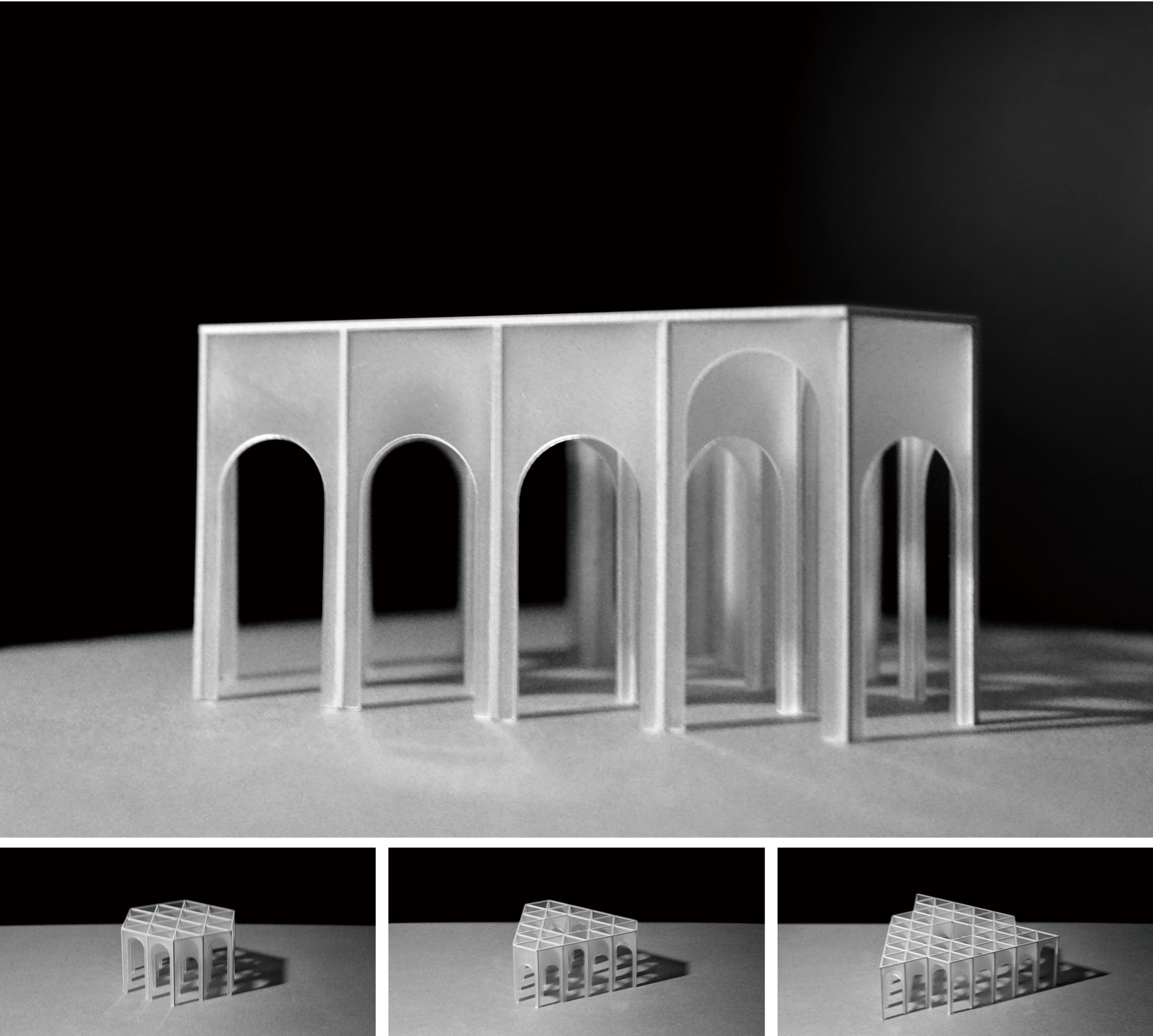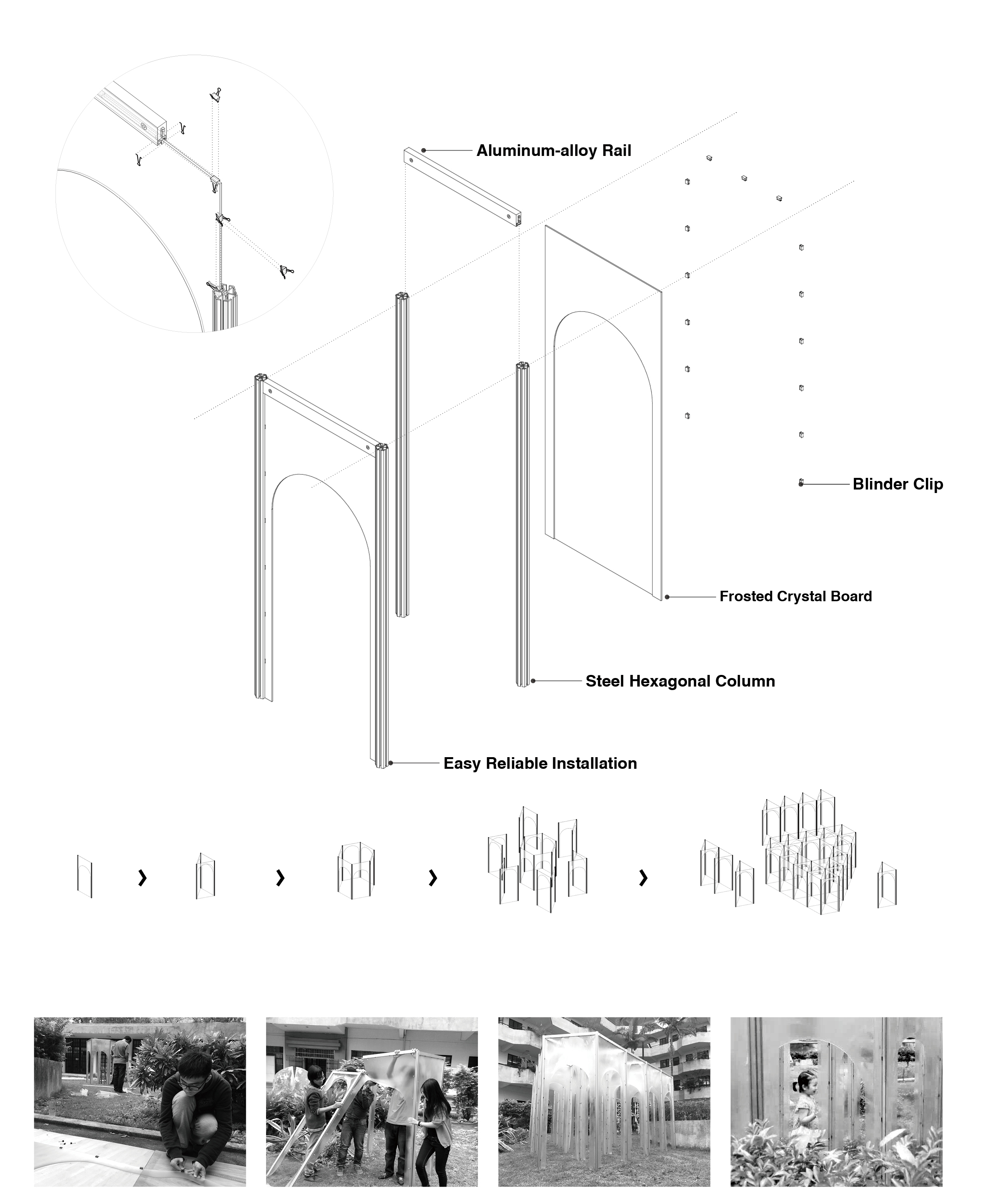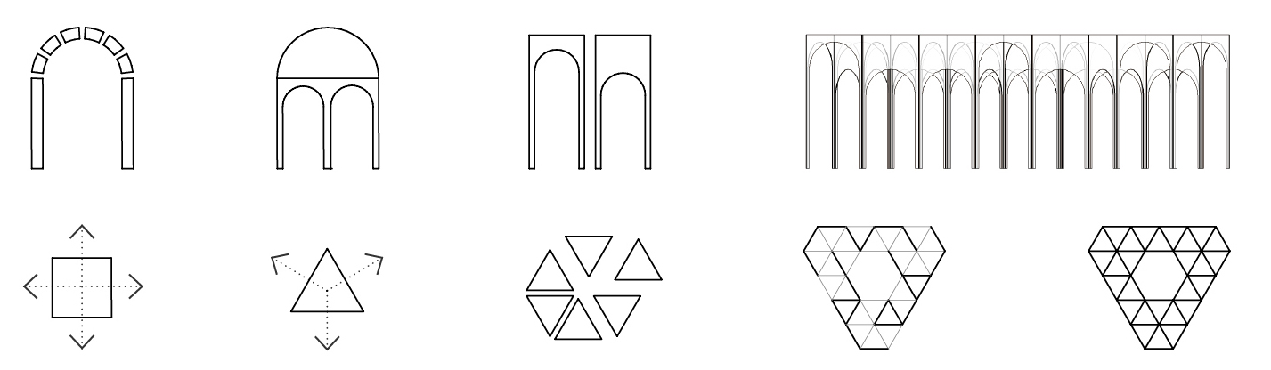 As a unit, door is for transportation and defining inside or outside. When it comes to combination, doors can enclose space for people to rest in. It is an inspiration from triumphal arch doorway, doors of different height define traffic space and staying space. Meanwhile trilateral form allows people to see scene in all angle from one single door. It can attract people to observe instead of going straight forward and blur the space inside or outside, dynamic or static.