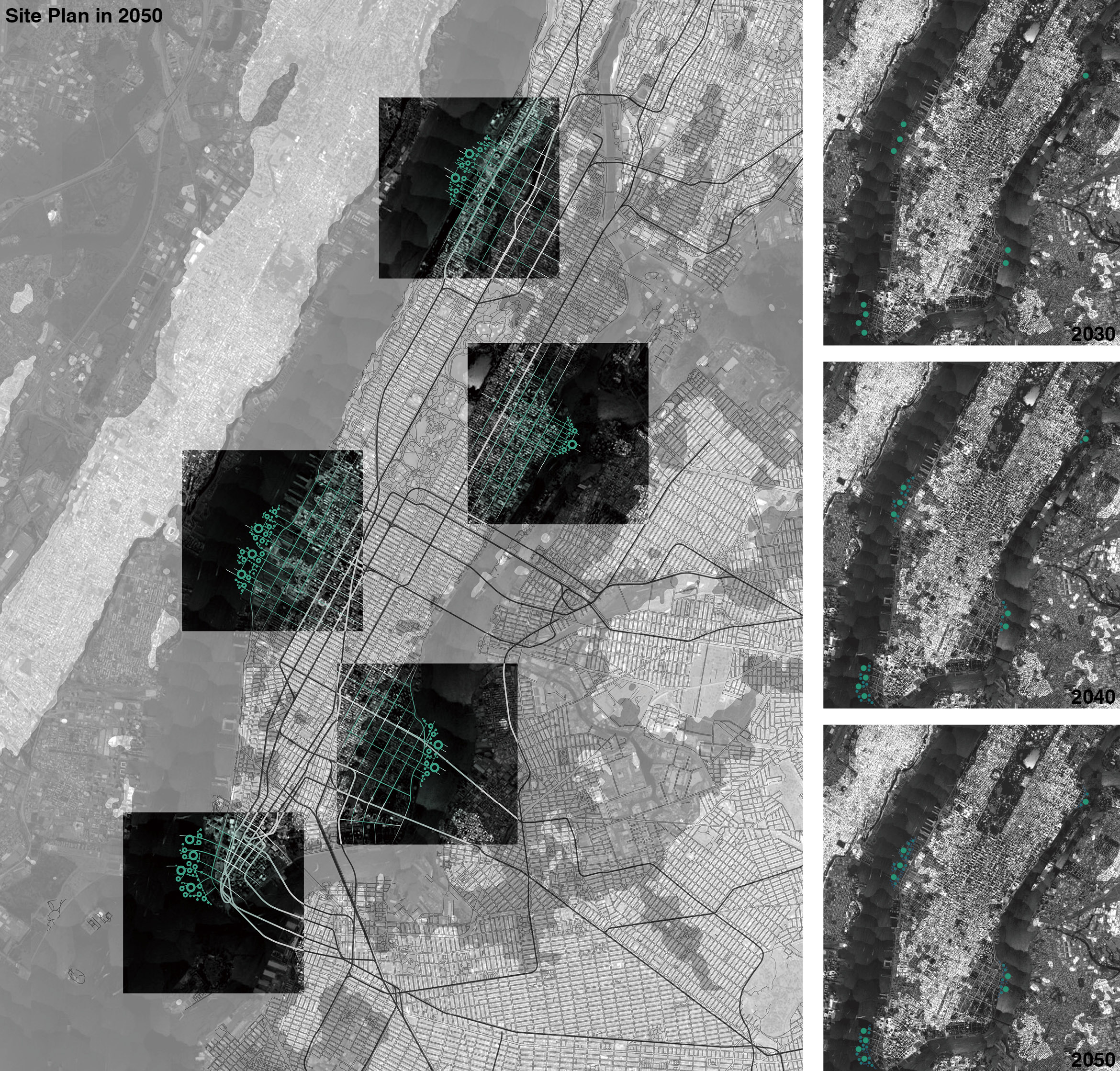 With the sea level continually rises over decades, most of the power generation plants and water treatment plants in New York City were flooded and not able to function anymore. By 2050, the overall capacities of electricity and water were reduced to around ten percent of the nowadays', so did the delivery system, aged and confronted great challenge of climate change and energy vulnerability. Algae bio-cathodes, as an emerging technology dealing with the salt water desalination and algae biomass accumulation for electricity generation, helped develop new strategies to feed New York City. Based on the Manhattan urban grid, supplementary distribution system was established and replenished by the high-rising algae towers, an innovative type of fresh water and electricity generation plant.